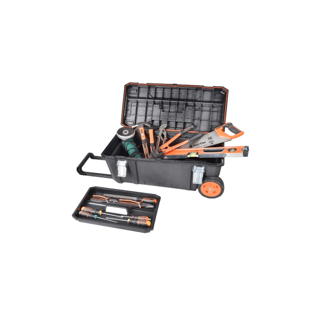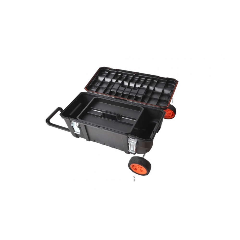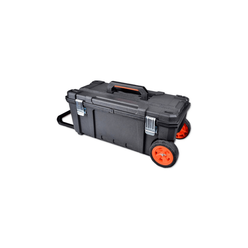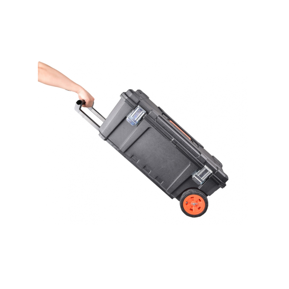 Equipada con ruedas grandes recubiertas en goma (15 x 5 cm) y un mango de acero extraíble, permite moverla fácilmente, incluso con carga pesada. Su gran capacidad interior la hace perfecta para herramientas eléctricas, manuales o insumos de gran tamaño.
