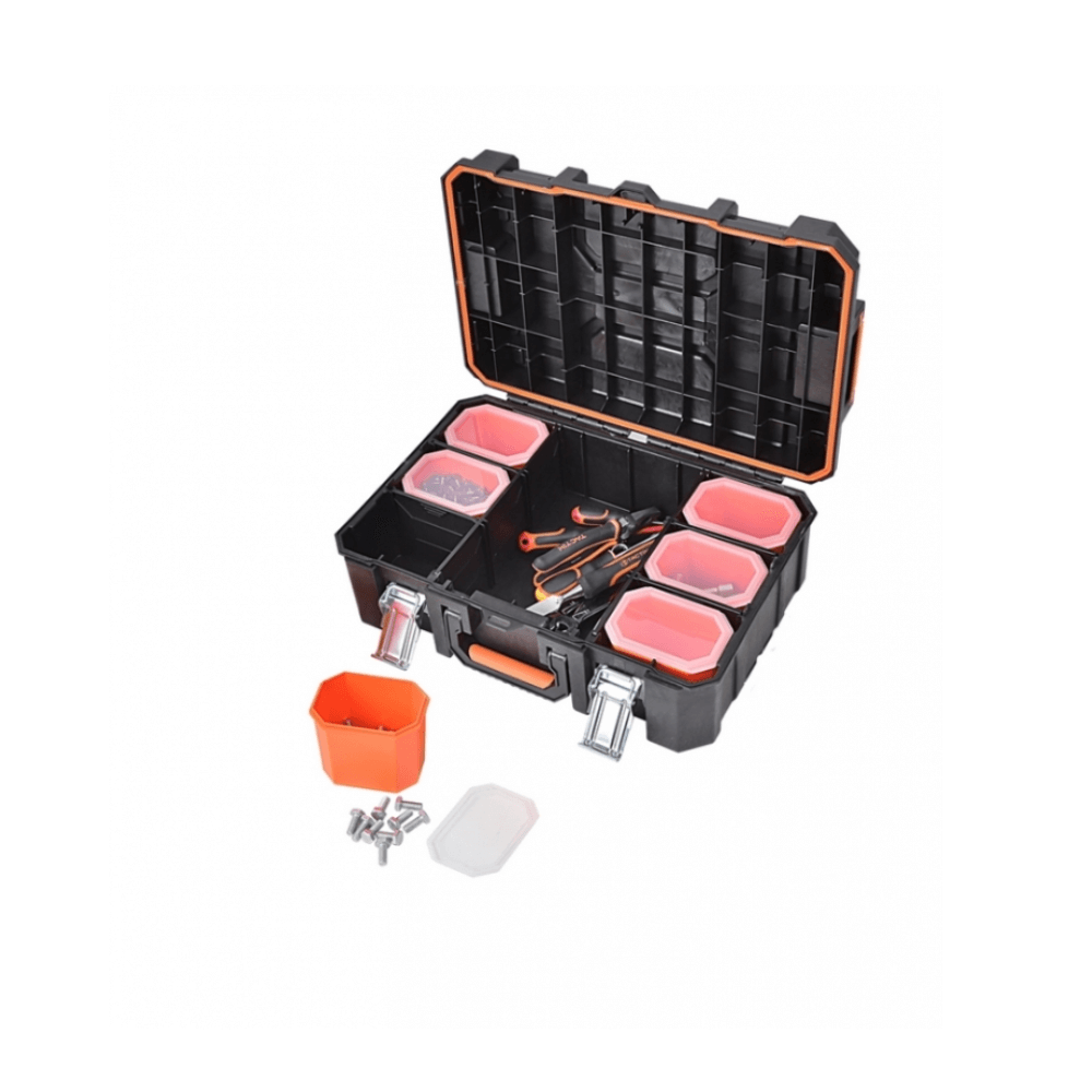 Perfecta para técnicos, electricistas, mecánicos, instaladores y organizadores que necesitan una caja de uso profesional, modular y altamente portátil.