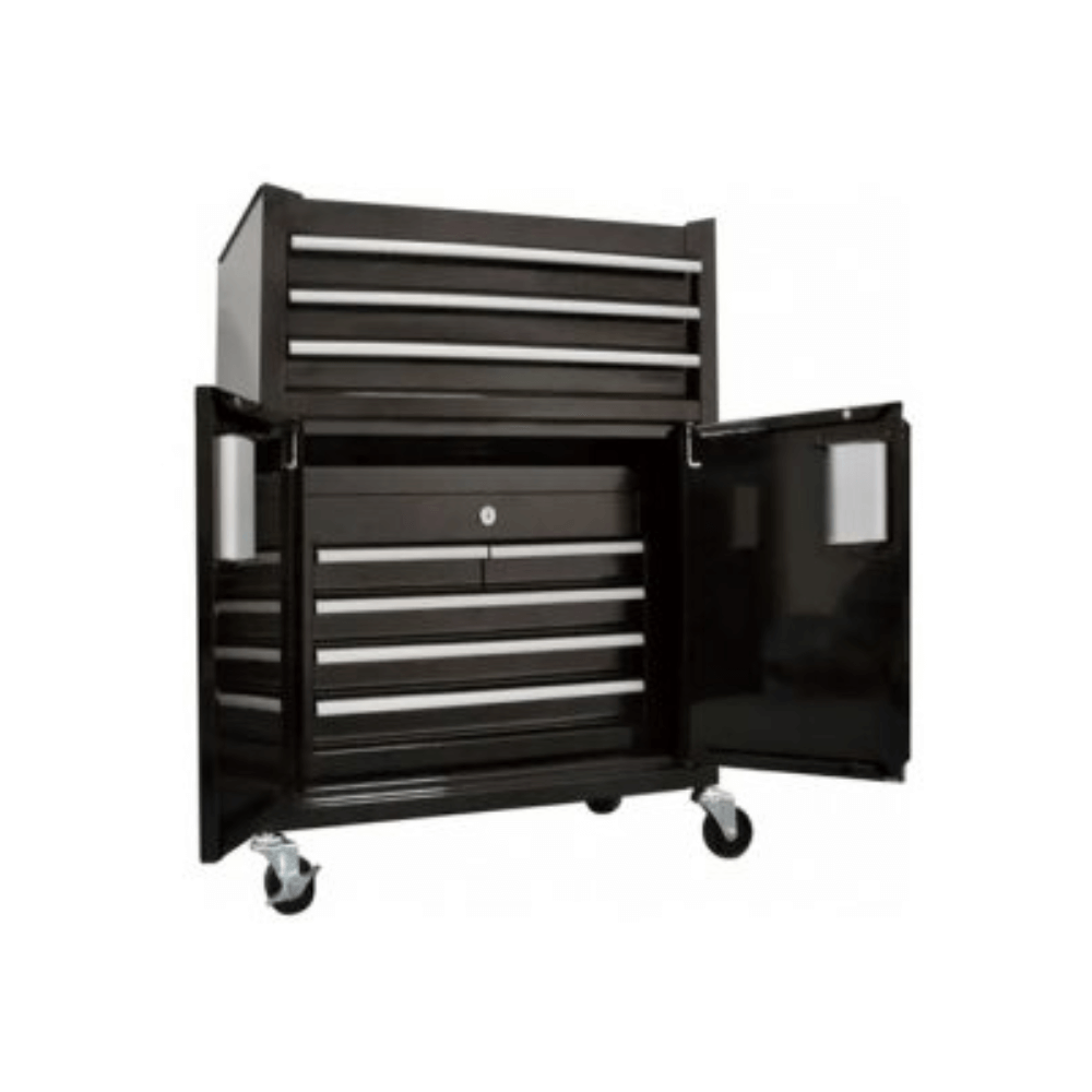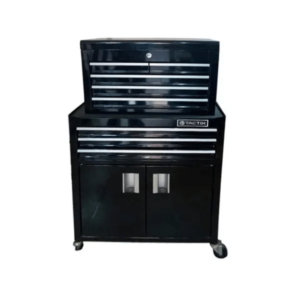 Carro metálico para herramientas Tactix modelo 326096, ideal para talleres y profesionales que requieren orden y movilidad. Cuenta con 8 bandejas extraíbles, 1 gabinete con puertas abatibles y ruedas con freno para un traslado seguro.
