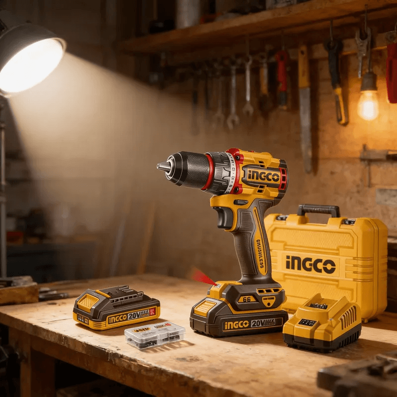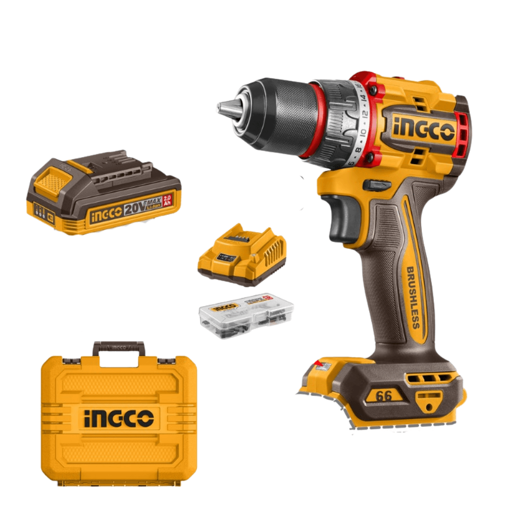 | Potente taladro Ingco | Taladro atornillador Ingco 20V brushless con 66Nm de torque, 2 baterías 2.0Ah, cargador y 47 accesorios. Potente, versátil y listo para todo tipo de trabajos. |